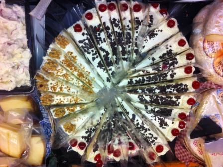 halten Schwazwälder-Kirsch-Torten, Walnuß-Trauben-Torten und Birne-Preiselbeer-Torten in übersichtlichen Tortenstückchen für Sie bereit (100Gramm/€1,59). Hergestellt auf Basis von Tortenbrie und Bayernland Frischkäse.